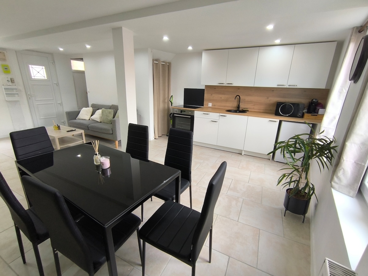 El alojamiento El apartamento está en 2 plantas con 2 habitaciones en fila. Ideal para una pareja con hijos. Se accede a través de una escalera exterior que conduce a una terraza con vistas al jardín privado con vistas a la Iglesia de St Denis. El apartamento tiene en la 1.ª planta una amplia sala de estar con una zona de comedor contigua a la cocina americana, una sala de estar equipada con una estufa de leña, un baño con ducha y aseos separados. Una escalera interior conduce a 2 dormitorios en fila arriba.