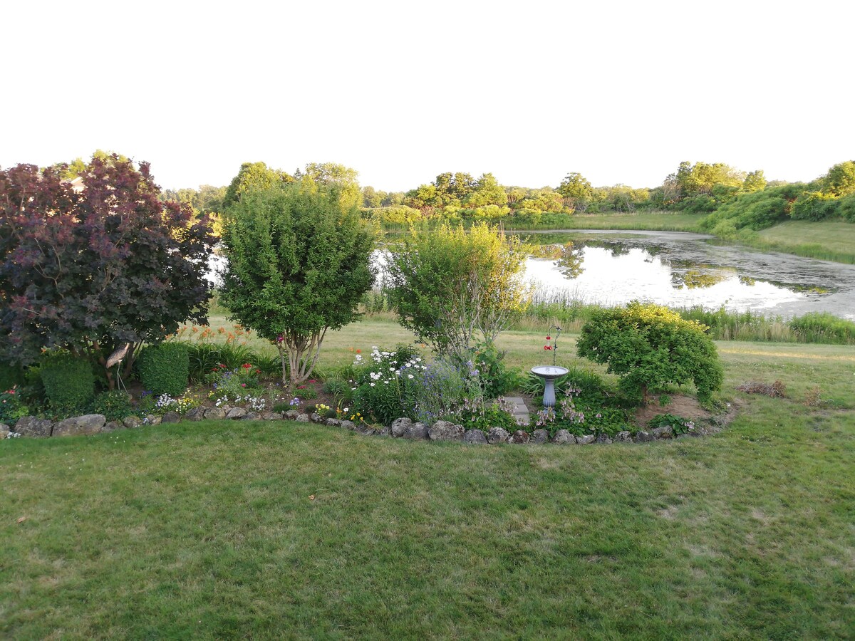 Oasis escondido en las afueras de la ciudad, con jardín privado de estilo inglés y un gran estanque con muchos visitantes emplumados. Lo suficientemente lejos del ajetreo y el bullicio como para sentirse en privado, pero lo suficientemente cerca como para caminar por la ciudad y regresar a casa. Entra en tus habitaciones desde una entrada privada a través del jardín, pasando el árbol de cornejo. Hay té y café disponibles en el armario debajo del microondas.