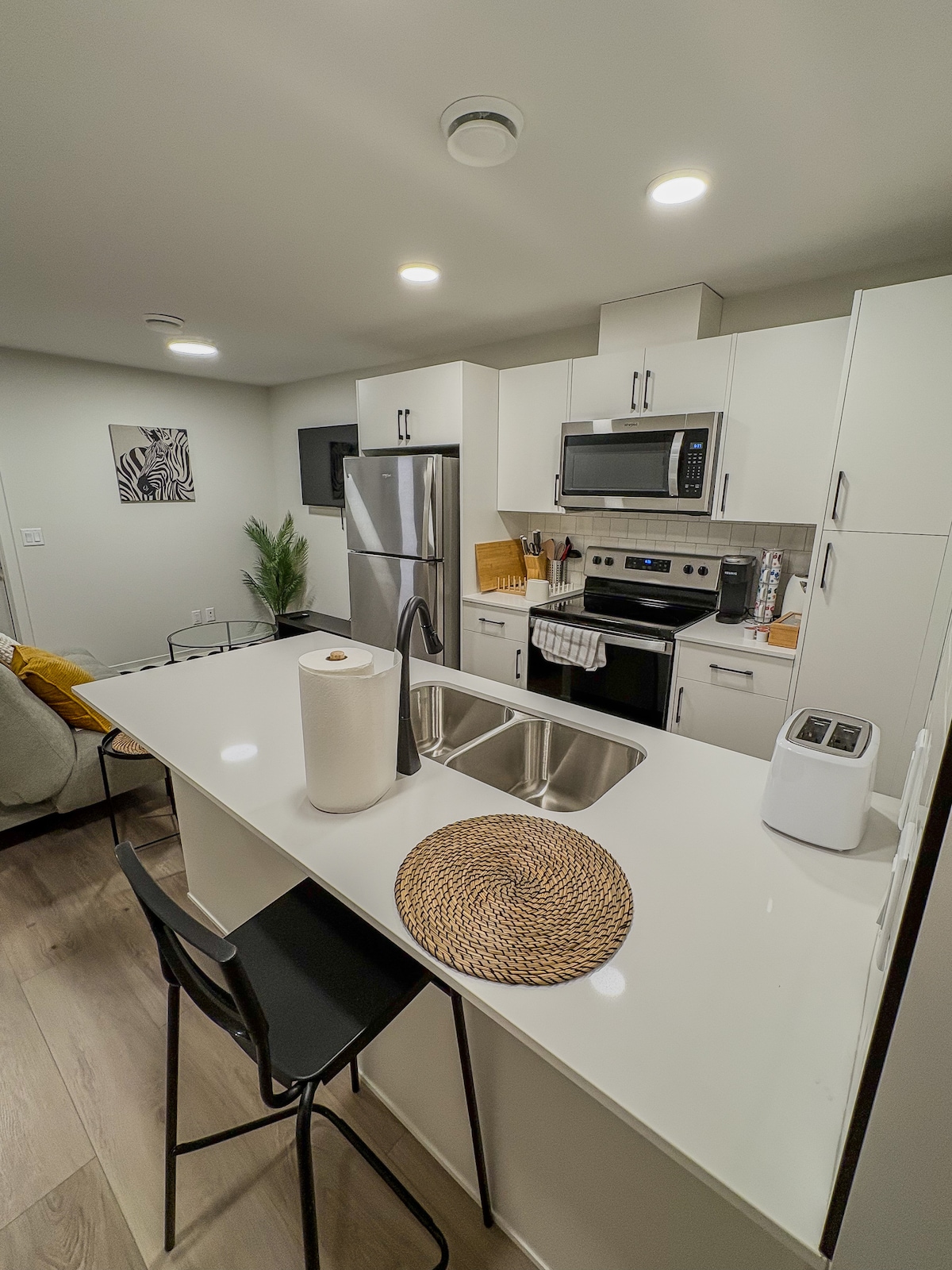 🏡 Key Features ✔️ Bright, spotless legal basement suite ✔️ 2 bedrooms with queen beds & hotel-style linens ✔️ Japanese-style futon for 5th guest only – extra use by request ✔️ Kitchen with milk Keurig coffee maker ✔️ Cozy living room with 58" Smart TV ✔️Stylish indoor hanging chair ✔️ Private entrance & easy self check-in ✔️ Free street parking or driveway spot 📍 Nearby ✔️ 2-min drive to shopping center ✔️ 15-min drive to Rabbit Hill Ski Resort ✔️ 20-min drive to YEG ✔️ 20-min drive to WEM
