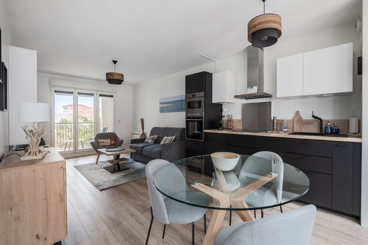 ⚠️ Parking inaccessible le : 14 et 15 août pour les fêtes de la mer (peut-être inclus le 13 et 16 août) 21, 22 et 23 août braderie des commerçants Appartement avec balcon & parking – Hypercentre Arcachon Profitez d’un séjour au cœur d’Arcachon (Ville d’Été) dans cet appartement cosy avec balcon et parking privatif disponible (+10€/nuit). Situé juste en face de la plage principale, c’est le package idéal pour un couple en quête de confort et de tout à pied.