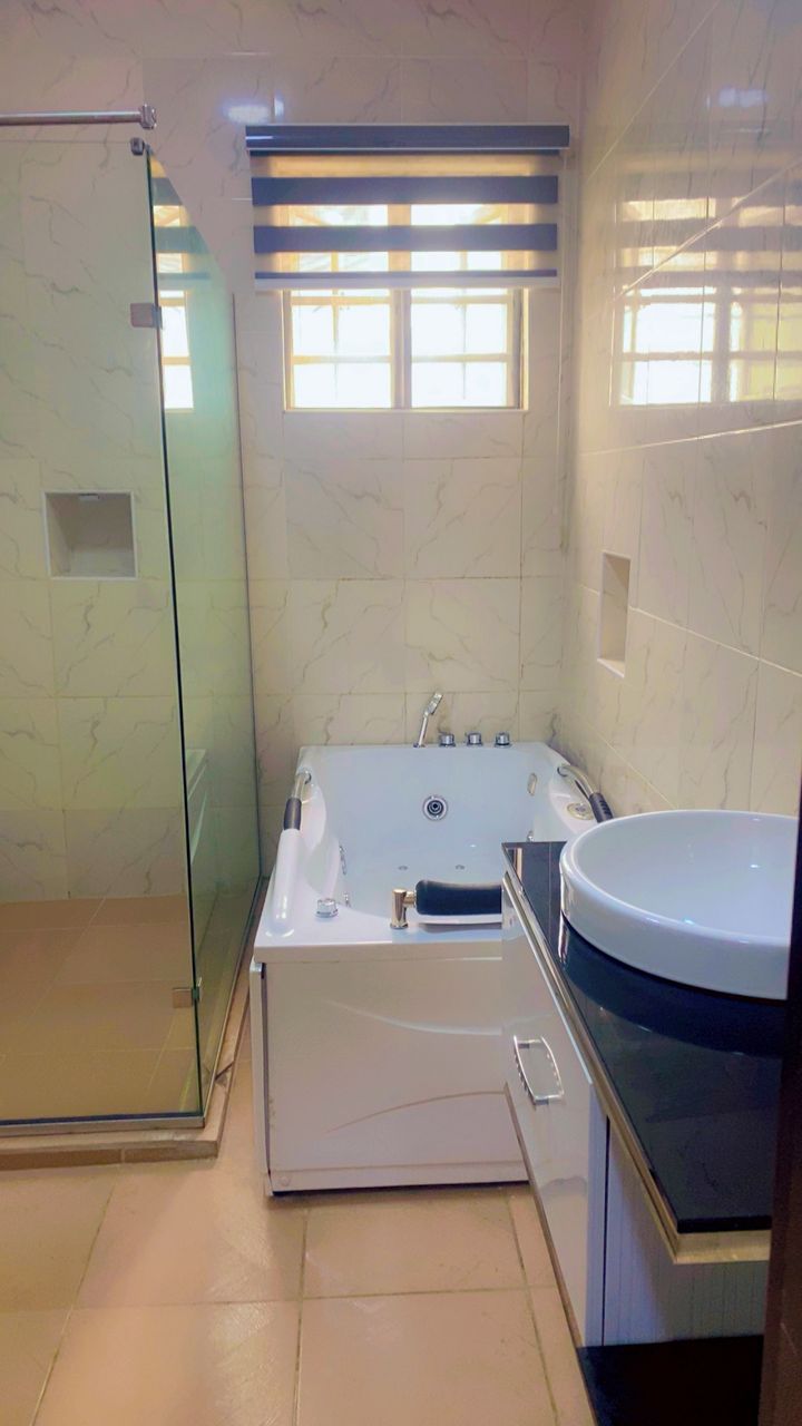 Spacious sitting room and royal ensuite room with Super king bed, modern bathroom and toilet 🚽. Very clean and standard apartment. Royal Pent House gives you all modern comfort beyond your imagination with unlimited high speed WiFi, 43inchSmart Tv in the bedroom and 55inch Smart Tv in the sitting room, YouTube, Netflix, DSTV. Comfortable Sofa, Water heater, Water kettle, Microwave, Cooking gas. Smoke Alarm, Mono dioxide Alarm, 24/7 power. , Cctv, maximum security with 24/7 security personnel