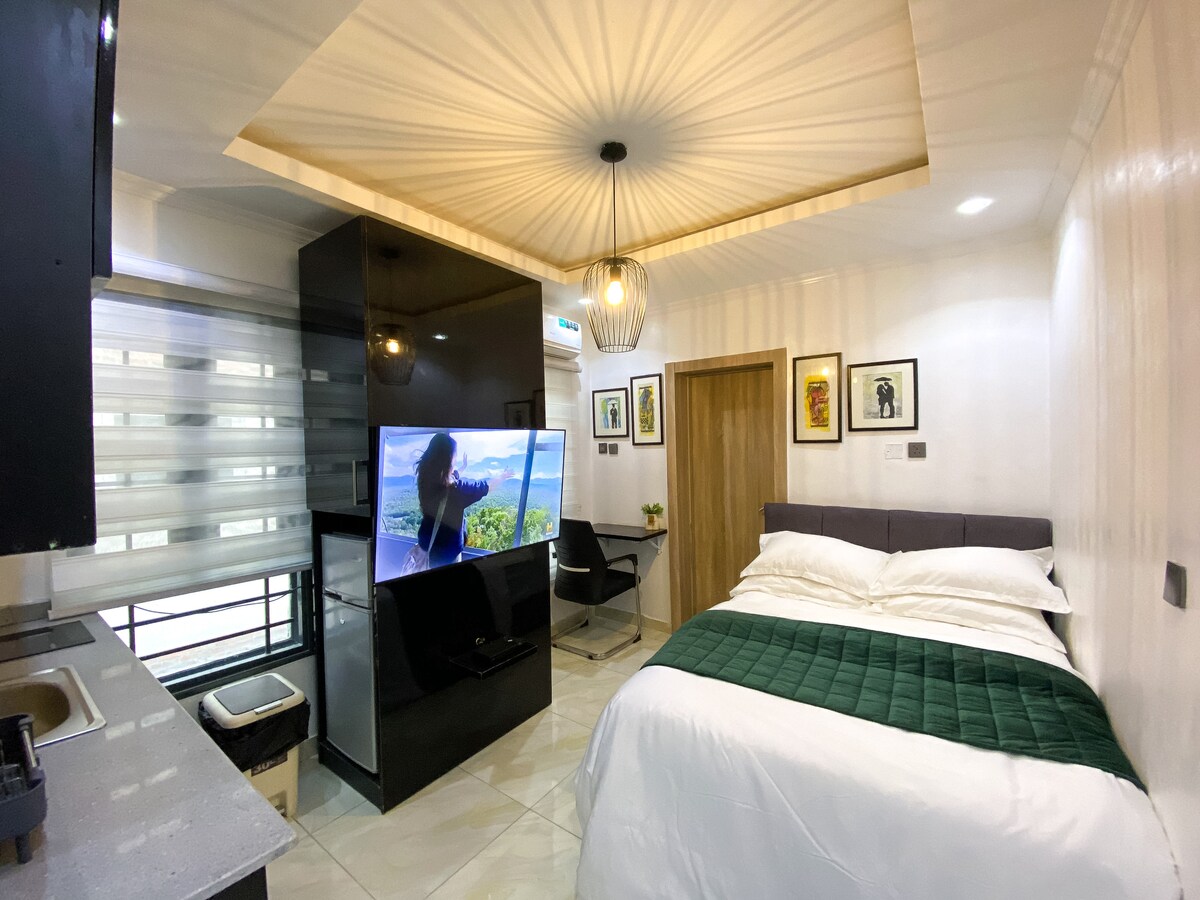 Disfruta de este estudio limpio y acogedor en una finca segura de Lekki Phase 1, perfecta para viajeros solitarios o parejas. El espacio cuenta con una cómoda cama, TV inteligente, wifi de alta velocidad, microondas, hervidor de agua y artículos básicos. También tendrás energía las 24 horas, los 7 días de la semana, una seguridad sólida y acceso rápido a tiendas, cafés y carreteras principales. Tanto si estás aquí para relajarte como para trabajar, tienes todo lo que necesitas.