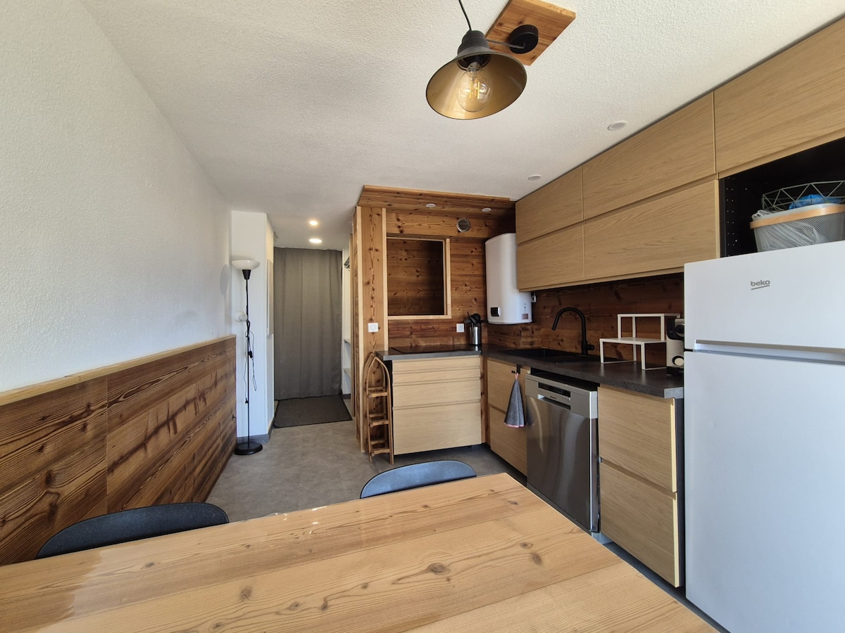 Acogedor apartamento reformado con bonitas vistas a las pistas. - Superficie: 20 m2 - Capacidad: 4 personas - Ubicación privilegiada en el corazón de la estación. Todos los servicios están cerca (remontes, panadería, supermercado, quesería, restaurantes, bares y alquiler de equipos). - Parada para el servicio de transporte gratuito al pie del edificio. Dado que el estacionamiento es de pago recientemente en la estación, puede elegir entre el estacionamiento cubierto de Venosc y el de los Glaciers (40€/s).