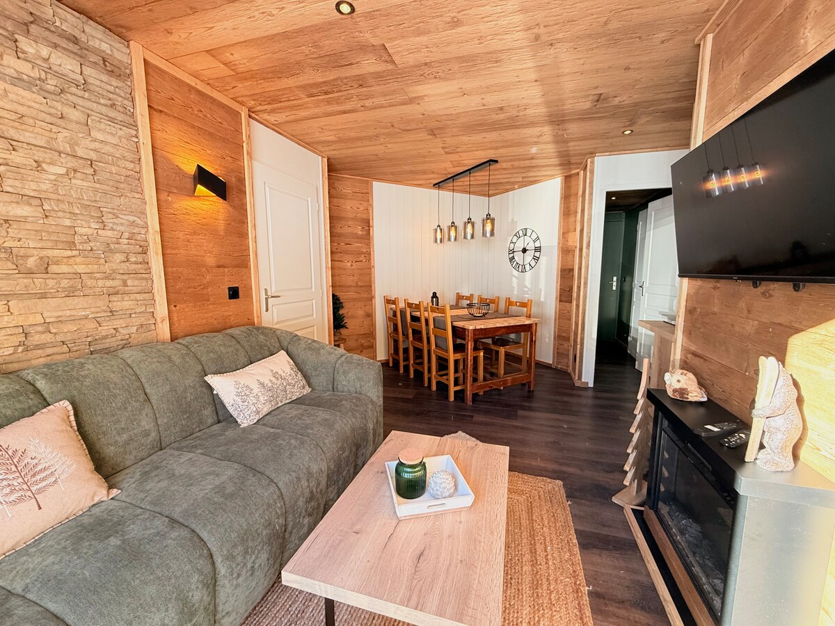 Gran apartamento **** cálido y muy luminoso totalmente renovado en otoño de 2024. Cuenta con 2 habitaciones independientes con 2 camas dobles, una litera y un sofá cama de 160. La exposición sur es ideal para disfrutar del sol todo el día en la terraza, con vistas a las pistas, al abrigo de las molestias. Cuenta con una plaza de aparcamiento cubierta, un guardaesquís y acceso directo a las tiendas, restaurantes, alquiler de material y clases de esquí. Residencia con piscina.