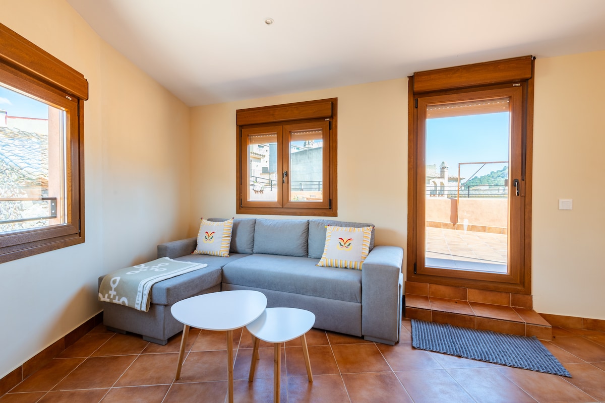 Apartamento con vistas a la montaña con WIFI. Muy acogedor y luminoso. 1 dormitorio con cama de matrimonio y sofá cama en el comedor. Ideal para familias y grupos de amigos para 4 personas. Ropa de cama incluida. Cocina completa con utensilios, nevera, lavadora y horno. El lavabo cuenta con toallas, jabón y papel higiénico. Televisión con ChromeCast (TV con internet) y calefacción. Tu mascota es bienvenida. Terraza grande con vistas increíbles. Entorno perfecto para escaladas, excursiones...