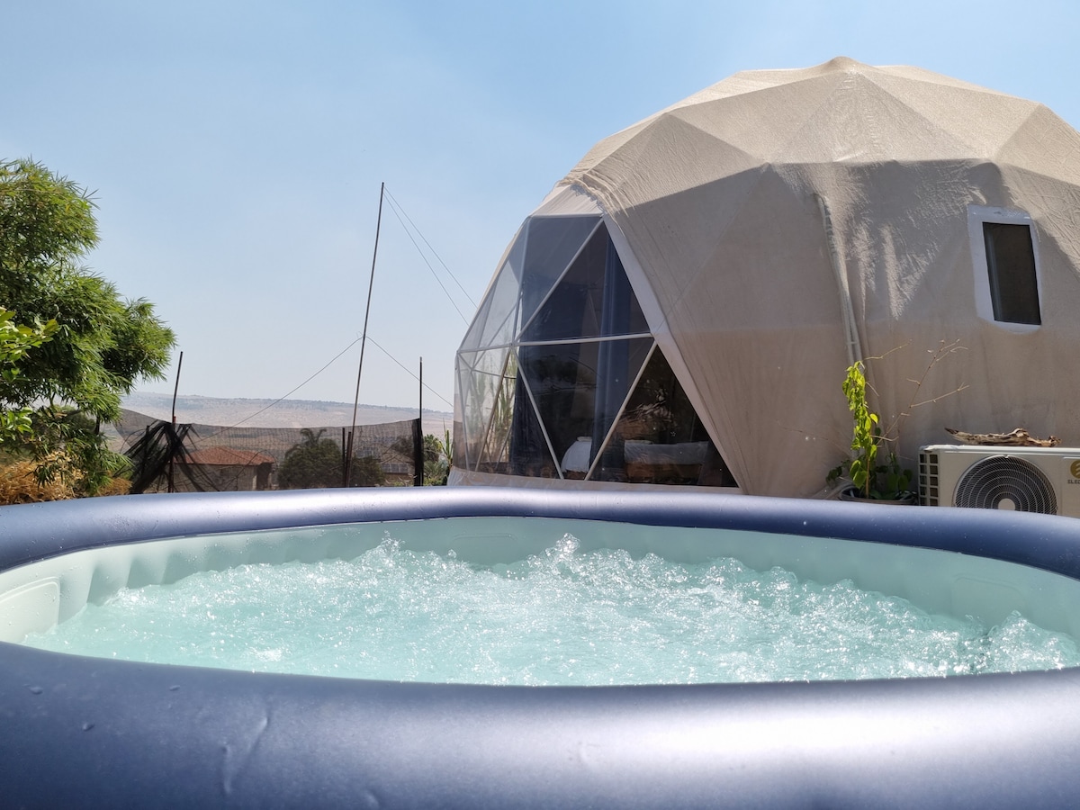 החלל הכי מיוחד שפגשתם: כיפת דום גאודזית מרשימה הניצבת בקצה המתחם של סוויטה בכפר, עוצבה בקפידה עד לפרטים הקטנים. הכיפה מחוממת/ממוזגת ומתאימה ללינה של זוג או משפחה קטנה: במרכז החלל מיטה זוגית ברוחב 1.60, ומולה טלויזיה SMART חדישה עם ערוצי טלויזיה NETFLIX ומגוון אפליקציות. מעל למיטה- קומת גלריה לילדים המתאימה ללינה של 2 ילדים. לכיפה הגאודזית שלנו מטבחון מאובזר עם כירת גז, מקרר, כלי בישול והגשה, פינת קפה, מיקרוגל וארונות אחסון מרובים. במתחם החצר המשותפת: בריכה מחוממת ומקורה, וג'קוזי ספא!
