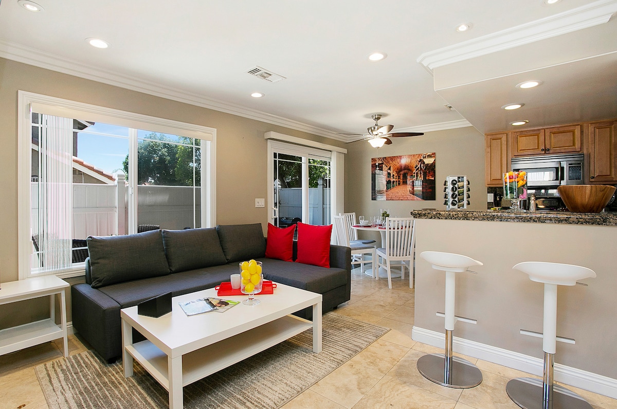 Los techos de rafter, los muebles de la granja costera y una paleta de colores de arena y blanqueada aportan las vibraciones tropicales al interior. Las familias pueden llevar juguetes a la playa para jugar junto a la orilla. Ubicado en el segundo piso e incluye un lugar de estacionamiento en el garaje. El bungalow está a una cuadra de la playa de Corona Del Mar, en las "calles de las flores", rodeado de casas multimillonarias. CDM Village, conocido por sus pintorescas tiendas, cafeterías, panaderías y restaurantes, está a la vuelta. Disneyland está a 20 millas de distancia.