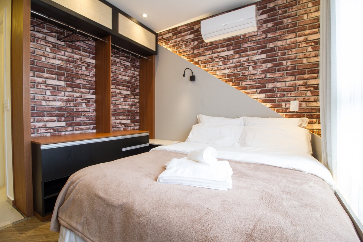 Estudio de diseño firmado por arquitectos en el corazón de Curitiba. Totalmente amueblado con una decoración moderna y contemporánea, electrodomésticos de primera categoría y acabados impecables. Tiene capacidad para 3 personas con una cama doble y una cama individual. Cocina completa, wifi de alta velocidad, TV inteligente y aire acondicionado. Perfecto para el trabajo o el ocio. Ubicación privilegiada en el centro, cerca de todo. ¡Disfruta de una experiencia de alojamiento superior en un espacio único y sofisticado! La ducha es perfecta😍