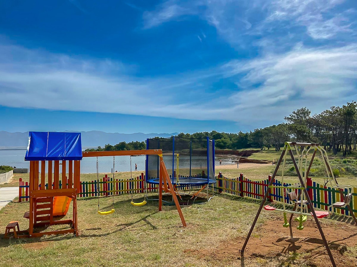 El departamento tiene una amplia terraza con vistas al mar, dos habitaciones separadas con camas dobles, una cocina totalmente equipada, comedor, televisión, ducha e inodoro, internet y estacionamiento gratuito en el patio. Varias amplias playas de arena se encuentran a 100 m de la casa, así como otras playas variadas, como las más pequeñas, rocosas e íntimas. Justo al lado de la playa más cercana hay un paseo marítimo junto al mar con hermosas vistas que conduce al centro del casco antiguo de Rab. Además, cerca hay numerosas instalaciones como bares de playa, restaurantes, masajes, cajeros automáticos, panaderías, una tienda de alimentos, tiendas, botas de taxi y algunos deportes para adultos y niños, como ejercicios gratuitos todas las mañanas con un entrenador en el mar, parques infantiles y parques infantiles organizados al aire libre, botes a pedales, kayaks e instalaciones similares.