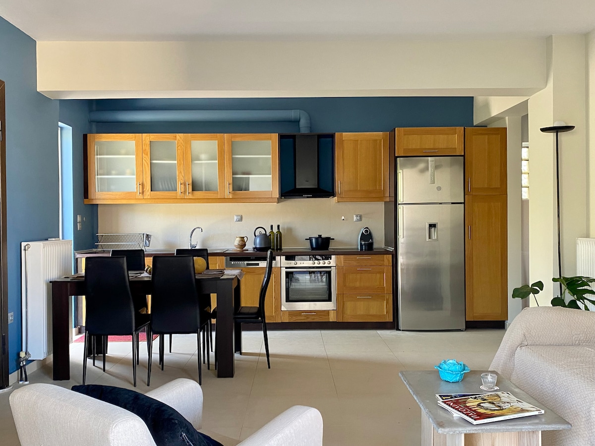 Apartamento acogedor, espacioso y cómodo en Nafplio, de nueva construcción y amueblado, con un hermoso patio y una chimenea, ideal para excursiones durante todo el año. El departamento pertenece a un pequeño bloque de pisos propiedad de mi familia, y donde también se encuentra mi casa. Yo o mis padres siempre estaremos cerca para brindar nuestra ayuda y mostrar nuestra hospitalidad. El apartamento en planta baja está en una zona tranquila, con un precioso jardín y chimenea, a 1500 metros del casco antiguo y del puerto.