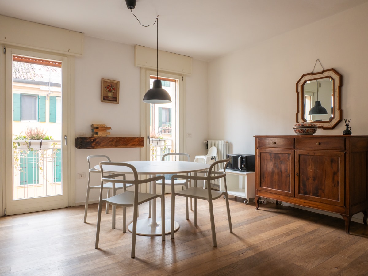 This elegant and unique apartment is perfect for a couple looking to enjoy the romance of Venice. A private terrace on the water allows for romantic breakfasts or candlelit dinners. The large bed, spacious shower, and fine wooden finishes reflect great attention to detail. The apartment offers all comforts: TV, coffee machine, dishwasher, Wi-Fi, and air conditioning.