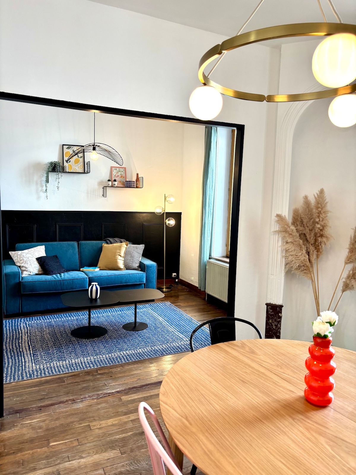 Alojamiento luminoso de 80 m2, decoración vintage, que consta de una cocina y un salón-comedor con un pequeño aire de los años 50-60, un dormitorio con los colores de los años setenta con una cama doble de 140 cm, y un segundo dormitorio, vuelta a los años 80, con 2 camas individuales de 90 cm y armario. Baño e inodoro separados. Terraza, jardín. Ideal para una familia de 4 personas. No se permiten fiestas ni celebraciones de cumpleaños.