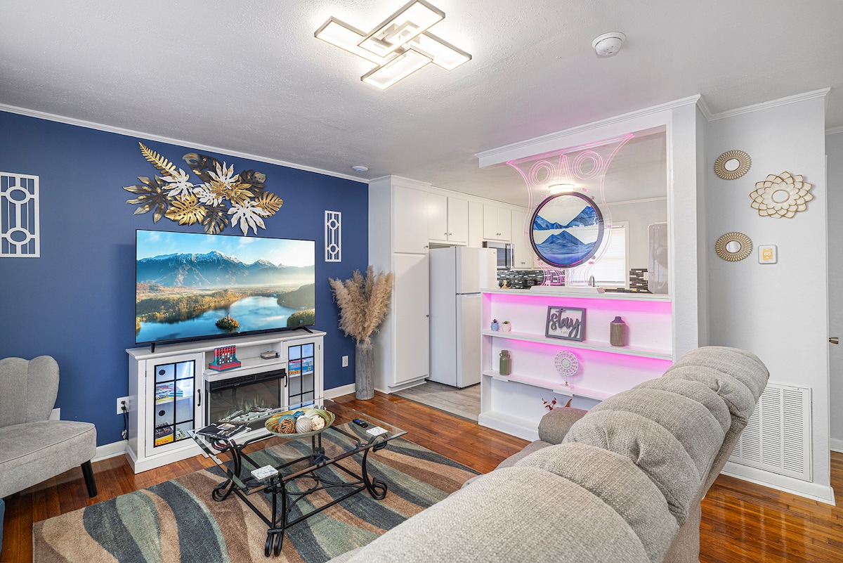 This unique home has a style all its own. Relax & recline while enjoying this custom interactive sand LED art piece that changes each time you rotate it! You choose the lighting of the Owl & Fireplace to fit the mood from soothing colors to an array of light shows. Enjoy a dual reclining couch in front of a fireplace and large TV on vintage hardwood floors. Relax with 2 Queen Beds, high speed internet, outdoor sitting porch, Keurig & Drip coffee maker, washer/dryer, Level 2 Tesla EV Charger.