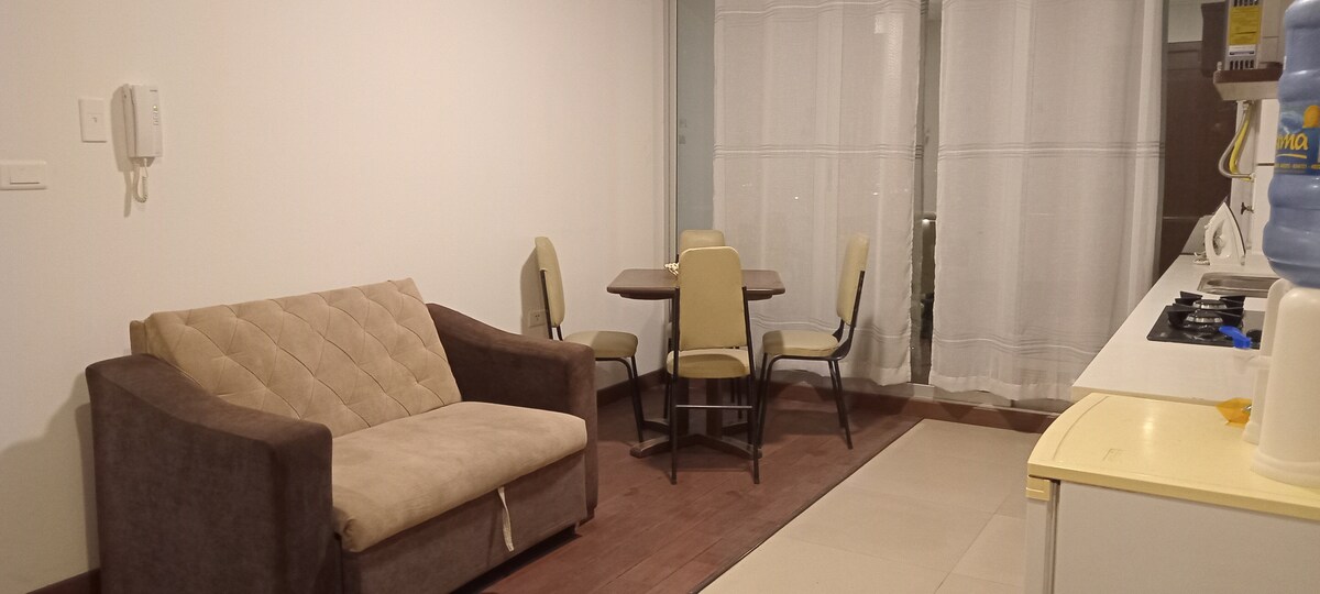 Descansa y disfruta en este moderno monoambiente, diseñado para brindarte confort y tranquilidad. Ubicado en una zona privilegiada, este espacio cuenta con todas las comodidades necesarias, incluyendo Smart TV, WiFi de alta velocidad, lavadora propia. Además, tendrás acceso a piscina (previa reserva), jacuzzi y sauna (pago por uso). Perfecto para viajes de negocios o escapadas a la ciudad. Disponible de parqueos para alquilar en el edificio.