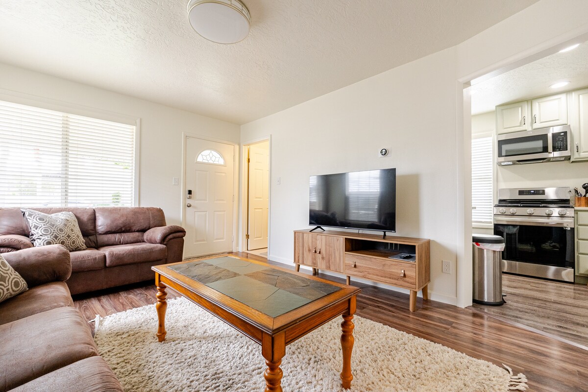 Acogedora suite de invitados de nivel inferior con 1 dormitorio y 1 baño en un barrio tranquilo, a pocos pasos de la I-15 y el Punto de Acción de Gracias. Duerme profundamente en un colchón morado 3. Disfruta de un televisor OLED 4K de 65 pulgadas, Xbox One X con Game Pass, sistema de sonido estelar, nevera, microondas, Keurig y mesa de comedor. ¡Relájate en el jacuzzi cuando quieras! Nota: Entrada compartida, pero toda la sala de estar, el dormitorio y el baño son tuyos para disfrutar con total privacidad.