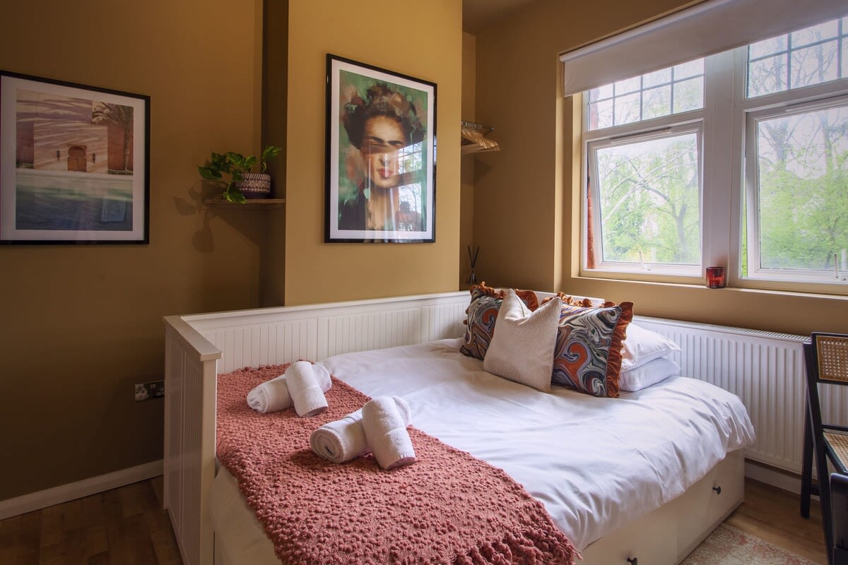 Moderno apartamento de 2 dormitorios con calefacción por suelo radiante, wifi súper rápido y espacio para hasta 6 huéspedes más bebés en cunas. Luminosa sala de estar de diseño abierto con sofá cama, cocina totalmente equipada y un gran balcón con vistas a Wembley. Perfecto para familias, viajeros de negocios y estancias de invierno más largas, con fácil acceso a Jubilee Line para viajar rápidamente por Londres. Ubicado en el vibrante Willesden Green, cerca de West Hampstead, Kilburn y Wembley, con cafés, parques, tiendas y mercados locales cerca.