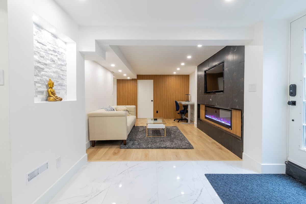 Recientemente hemos renovado nuestro sótano para crear una suite elegante, moderna, acogedora y tranquila. Hay una entrada lateral que se abre directamente a las escaleras que te llevan a la unidad. Tiene una puerta exterior metálica con cerradura para insonorización y seguridad. La unidad es un luminoso apartamento tipo estudio con tres grandes ventanales, una cocina completa, sala de estar con TV y chimenea, mesa de comedor, cama tamaño queen, vestidor y tu propio baño privado con una ducha de 5 pies. ¡Con amplia insonorización!