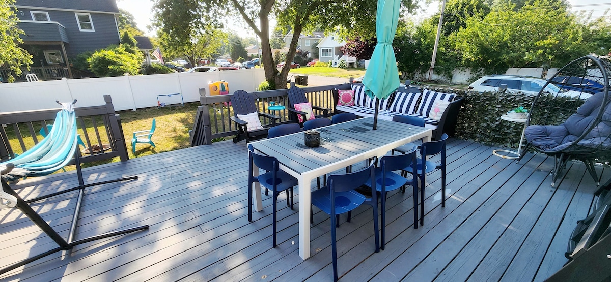 ¡Reserva tus relajantes vacaciones en la playa hoy mismo! Planta abierta, cocina totalmente equipada, dos camas, amplios asientos, patio grande, casa de huéspedes separada. Ubicado a 1/4 de milla (15 minutos a pie) de la playa. Fogata, asientos al aire libre, garaje. Cerca de Asbury Park, Pier Village y ferry a Manhattan. Wifi, lavadora y secadora, lavavajillas, cocina en la isla, comedor. Barrio tranquilo justo enfrente de Manahasset Park. ¡4 insignias de playa para Long Branch Beach incluidas!