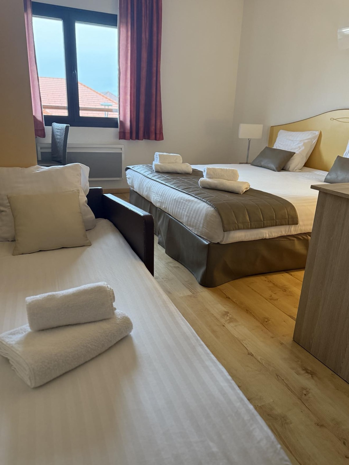 Relájate en nuestras cómodas y prácticas habitaciones dobles (24 metros cuadrados), equipadas con una cama doble o cama extraíble dependiendo de la configuración plana, aire acondicionado, ventanas insonorizadas y TV de pantalla plana. También disfrutarás del área de trabajo con un teléfono e internet inalámbrico. Para tu comodidad, el baño está equipado con un secador de pelo. Las habitaciones dobles son perfectas para estadías de varios días a varias semanas.