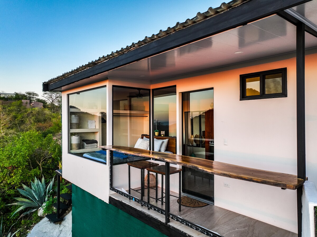 Desde esta ubicación en la cima de la colina sobre la bahía de Tamarindo, disfrutarás de una vista panorámica que es increíble. ¡Verás a qué nos referimos cuando llegues! ¡La Casita ofrece una cama tamaño king y una cama tamaño queen desplegable, totalmente equipada con baño privado, cocina y un pequeño balcón con vistas al mar y perfecto para ver monos en los árboles circundantes! ¡También tendrás acceso al espacio social de la propiedad, incluida una terraza cubierta con brisa junto a la piscina con vistas al mar y el salón en la azotea!