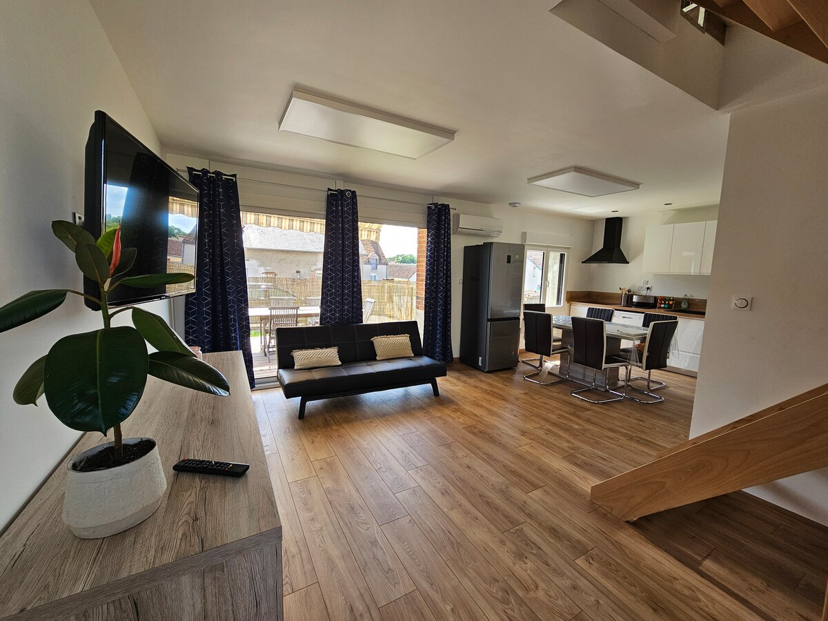 Este antiguo granero de Sologne, completamente renovado, equipado con todas las comodidades, en el corazón de Romorantin, a 500 m del centro de la ciudad, ¡le está esperando! Casa totalmente vallada, con 2 plazas de aparcamiento privadas, jardín y terraza. A 30 minutos del zoológico de Beauval y a 30 minutos del castillo de Chambord. Cerca de los castillos del Loira. EL ALOJAMIENTO: Adecuado para 4 adultos y 2 niños o 5 adultos. 1 dormitorio con cama de 160 por 200 y televisión. 1 dormitorio con cama de 140 por 190.