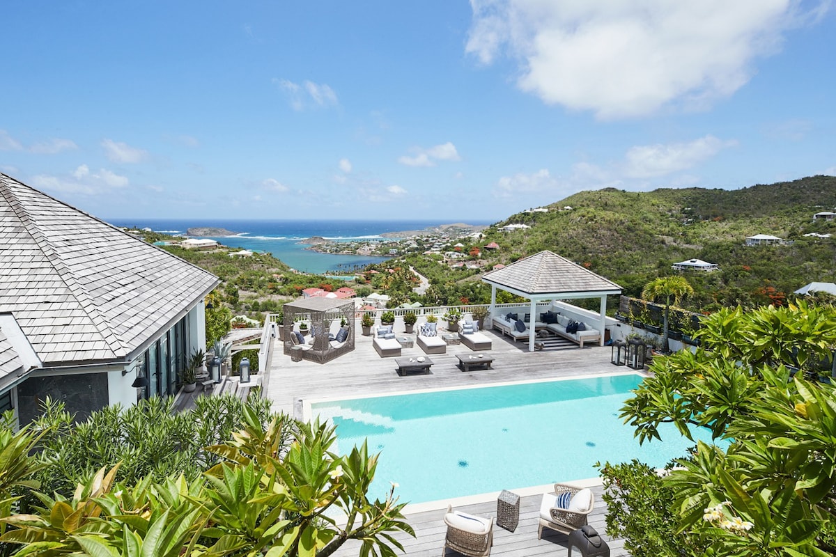 This spectacular oceanfront villa in St. Martin is located within Terrasse de Cul de Sac, within minutes of Orient Beach, Anse Beach Club, and Hope Estate. Newly renovated, the villa features a private boat dock and breathtaking views of the Caribbean Sea and Pinel Island. Ample alfresco living and dining spaces along with exquisite interiors set the stage for an unforgettable island escape, while six deluxe bedrooms (all with ensuite bathrooms) comfortably accommodate families, groups of friends, and destination wedding guests.