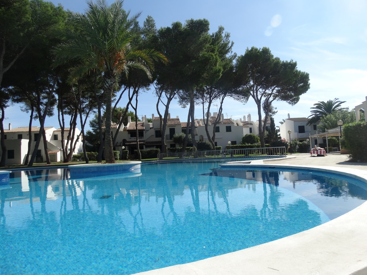 Apartamento completo de 1 dormitorio. Capacidad para 2 adultos y 2 niños. Ubicados dentro del complejo LAS BRISAS, en Son Xoriguer., Cala'n Bosch. Distribuidos en 2 plantas con terraza y zona de jardin. Bonita piscina con forma de trébol amplios jardines en zona de pinar comunitaria, mucha zona verde y espacio exterior. WI-FI gratis, servicio de limpieza y cambio de ropa durante la estancia, incluido en el precio.