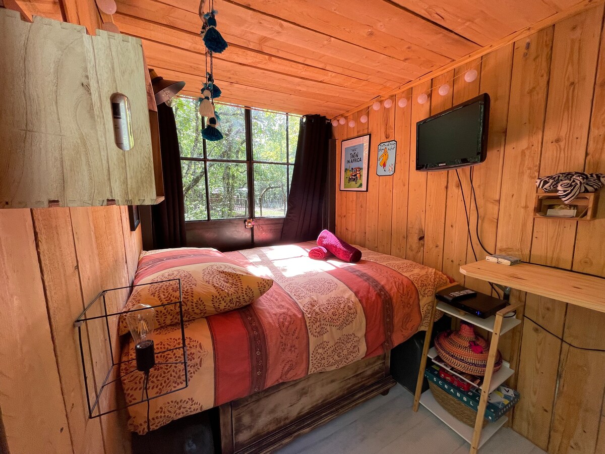 Caravana en la maleza en nuestra parcela de 2 ha cerca del pueblo de Savignac sur Leyze a 10 km de la bastida de Monflanquin. El alojamiento incluye una cama de 140, pero existe la posibilidad de cambiar la mesa por una cama para una persona. Los baños compartidos se encuentran en nuestra casa en reforma, accesible desde el exterior (ver mapa).