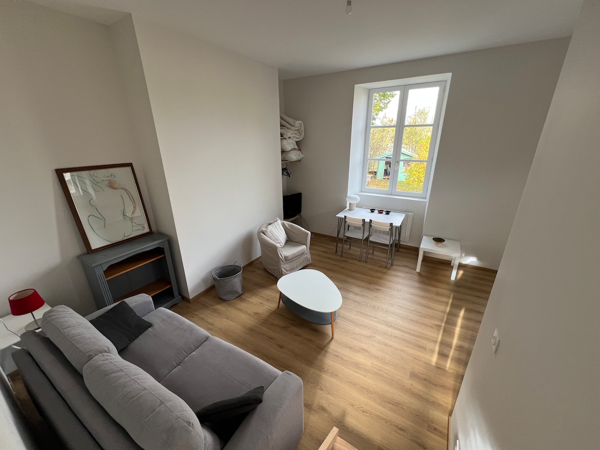 Estudio reformado de 32 m2 en el corazón del pueblo con entrada independiente y acceso a un patio interior con zona de comedor. Cocina equipada, cuarto de baño con ducha. Salón con zona de dormitorio (cama de 140). Apartamento para no fumadores El alojamiento está cerca de los comercios a pie: panadería, carnicería, supermercado. No se proporciona ropa de cama para estancias de más de 15 días. El acceso a la vivienda requiere bajar unos pocos escalones.