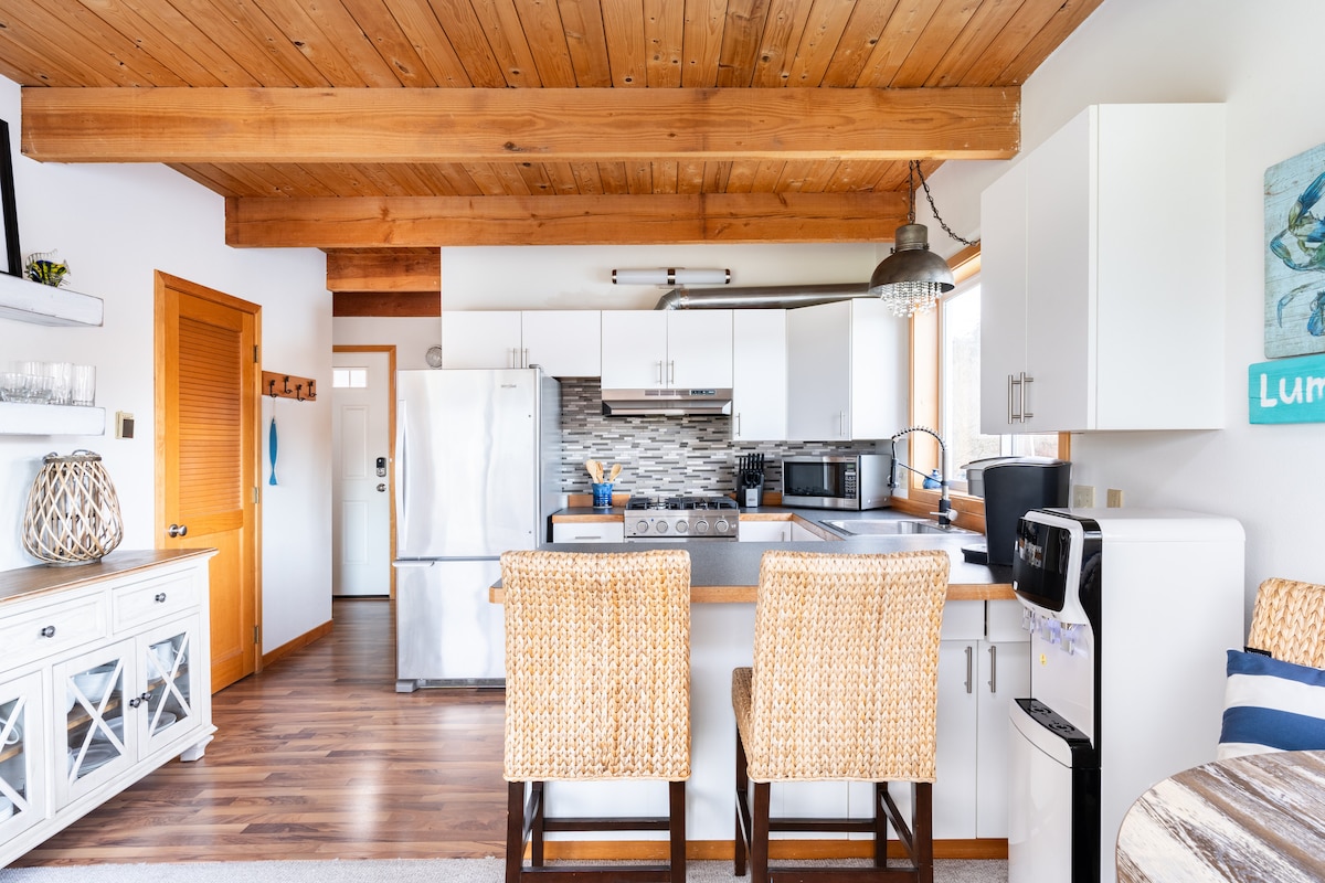 Disfruta de unas vistas impresionantes desde Chambers Haven, una casa de inspiración minimalista que utiliza paredes blancas y texturas de madera natural para crear espacios luminosos y acogedores. Sumérgete en el jacuzzi, siéntate alrededor de la hoguera y escucha las olas en el paseo marítimo. Toda la casa de huéspedes es tuya para que te relajes a tu manera.