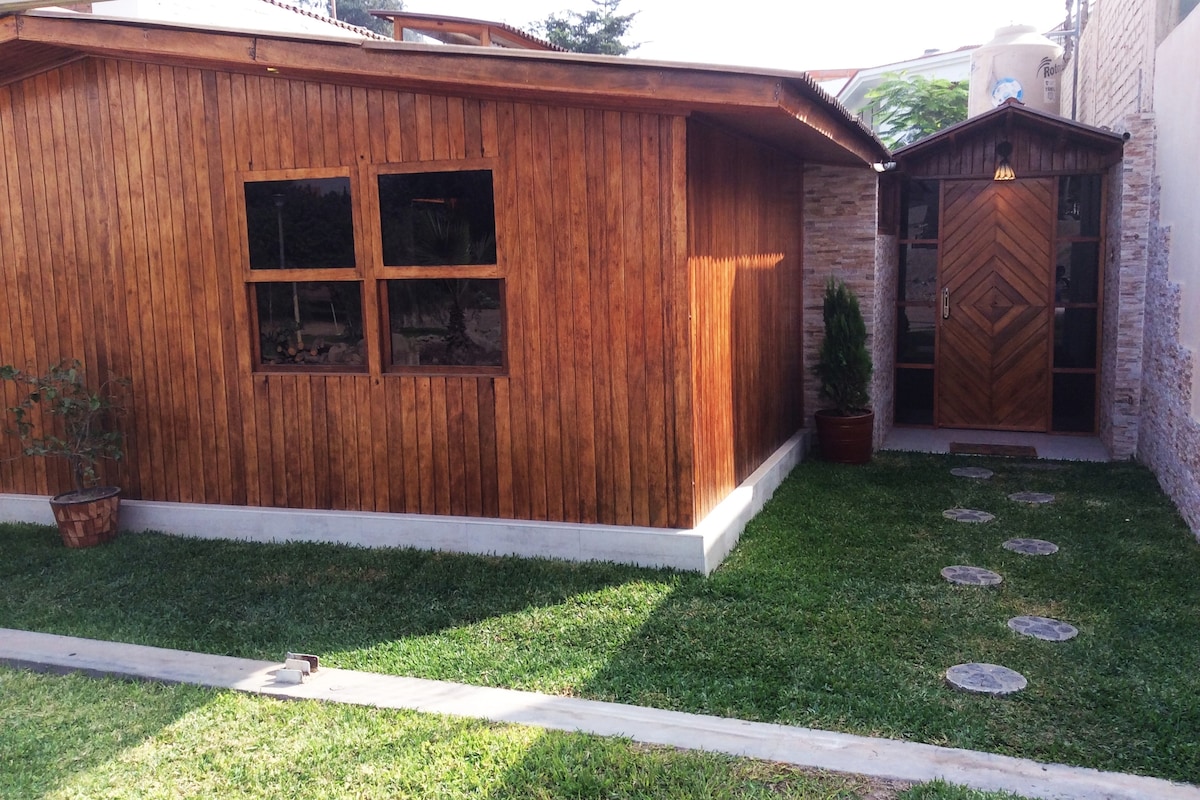 Encantadora Casa de campo, hecha en madera machimbrada con techo a dos aguas, un verdadero refugio en medio de la naturaleza, muy cálida y acogedora, cuenta con lo necesario para que su estadía sea confortable y placentera, es el lugar ideal para relajarte con la familia, en pareja y amigos. Ambiente totalmente privado, seguro, cuenta con jardines, parrilla, hamacas, jacuzzi, ducha española, TV con cable, Netflix, Internet, kitchenette con barra, electrodomésticos, comedor, terraza y menaje.