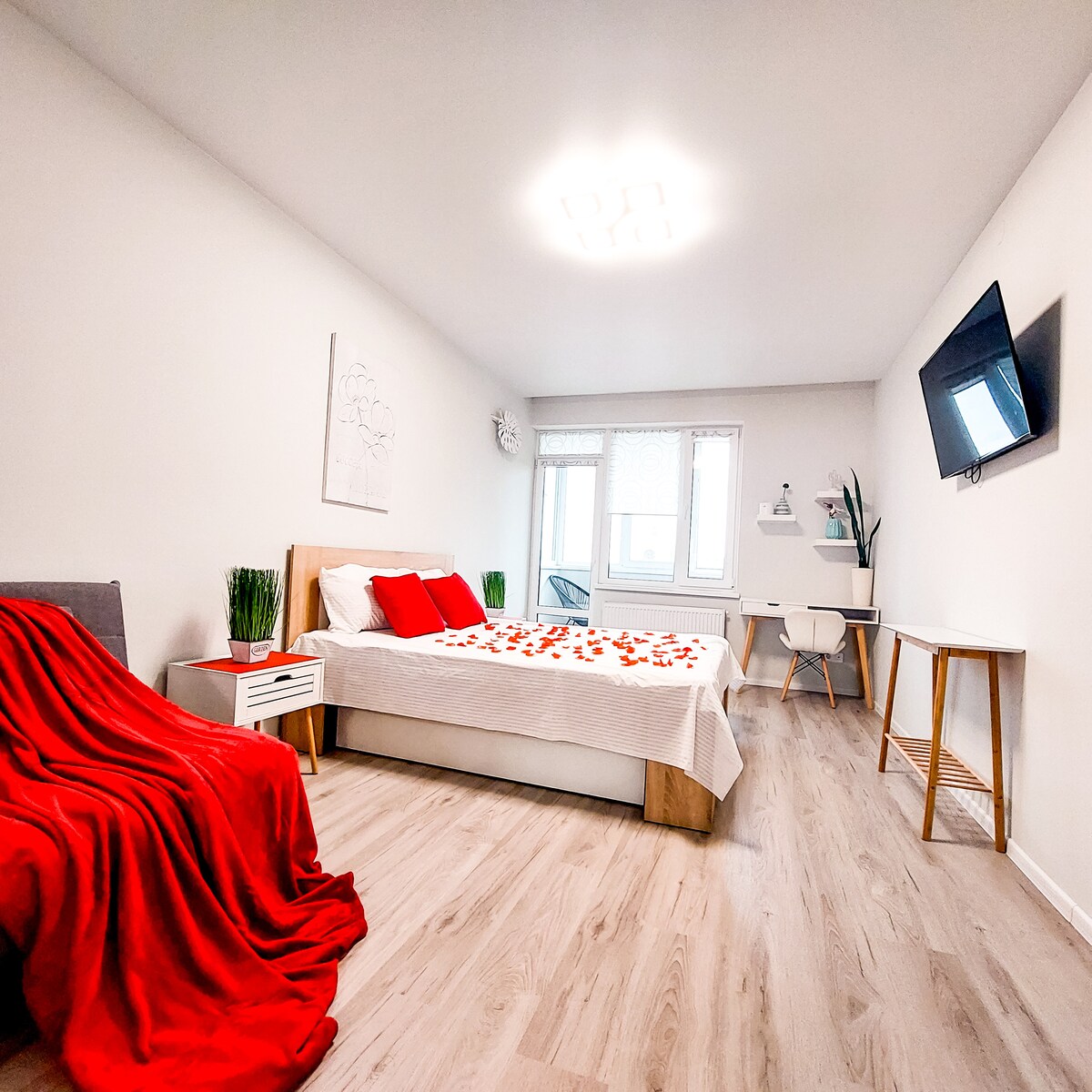 Our stylish 1-bedroom apartment is located in a quiet neighborhood within a 10-min walk to the railway station and a 20-min walk to the city center. It is equipped with high-speed wi-fi, an individual heating system, and a private balcony. You’d have a bedroom with a king bed, blackout blinds and a working station, a full bathroom with a washer and dryer, and living room with TV and dining table for 2, and a kitchenette. It can accommodate up to 3 people. We will be glad to have you!