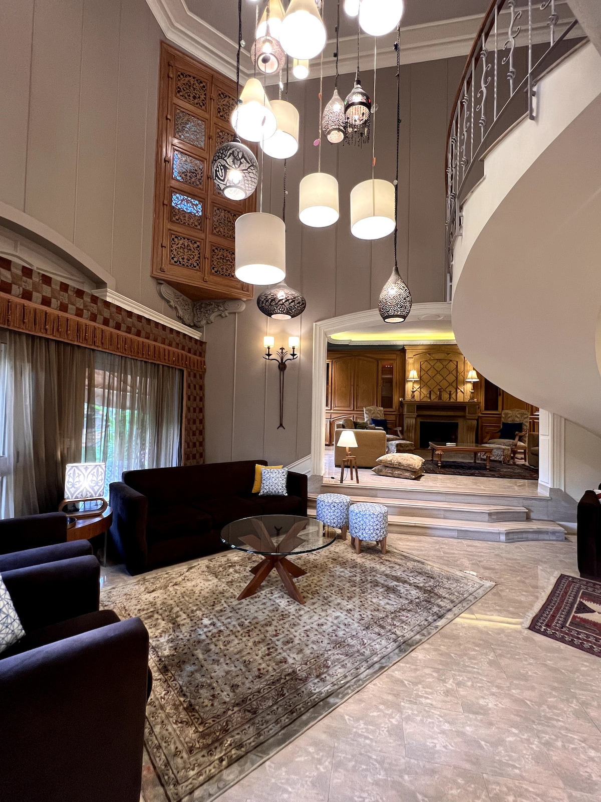 Nuestro moderno ático con piscina privada es perfecto para familias que buscan comodidad y lujo. Ubicado en una comunidad cerrada en la exclusiva zona de Nuevo Cairo, a solo 30 minutos del aeropuerto y cerca de servicios como KFC, Starbucks y una variedad de restaurantes occidentales y locales (Chili's, Fuddruckers, LongHorn Texas, Ibn Al Sham). Servicios como una cama tamaño king, lavadora, secadora, lavavajillas y microondas garantizan la comodidad, y 4 televisores inteligentes proporcionan entretenimiento.