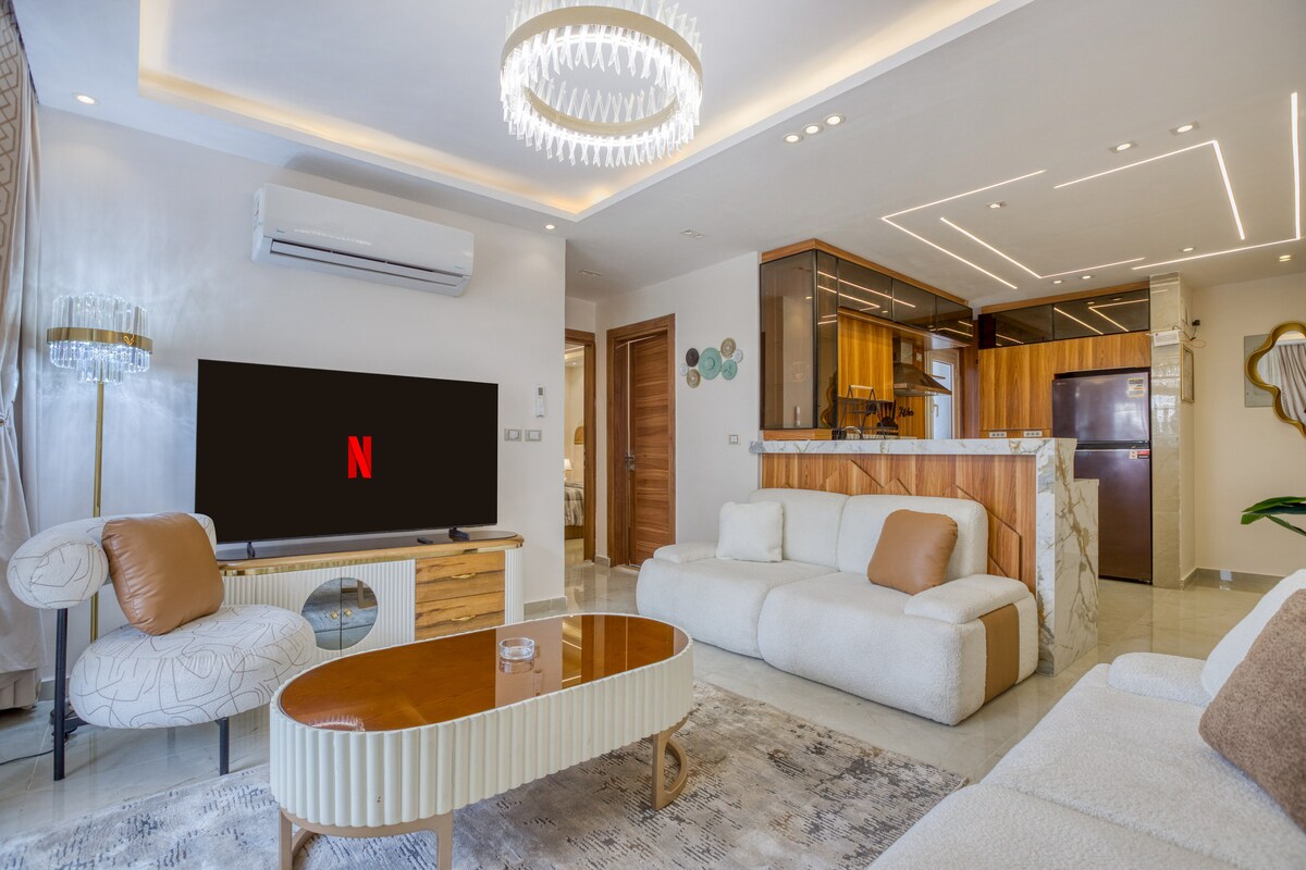 Este espacioso apartamento está totalmente amueblado y equipado con todo lo necesario para una estancia cómoda. Relájate y ve tus películas y programas de televisión favoritos en el sistema de sonido con acceso a Netflix, beIN Sports, Shahid, Watch it y Starzplay. Ubicado en una ubicación céntrica, cerca de todas las principales atracciones. A poca distancia a pie de la estación de autobuses, las tiendas y los restaurantes. Tanto si viajas por negocios como por placer, este moderno y elegante apartamento es el alojamiento perfecto.