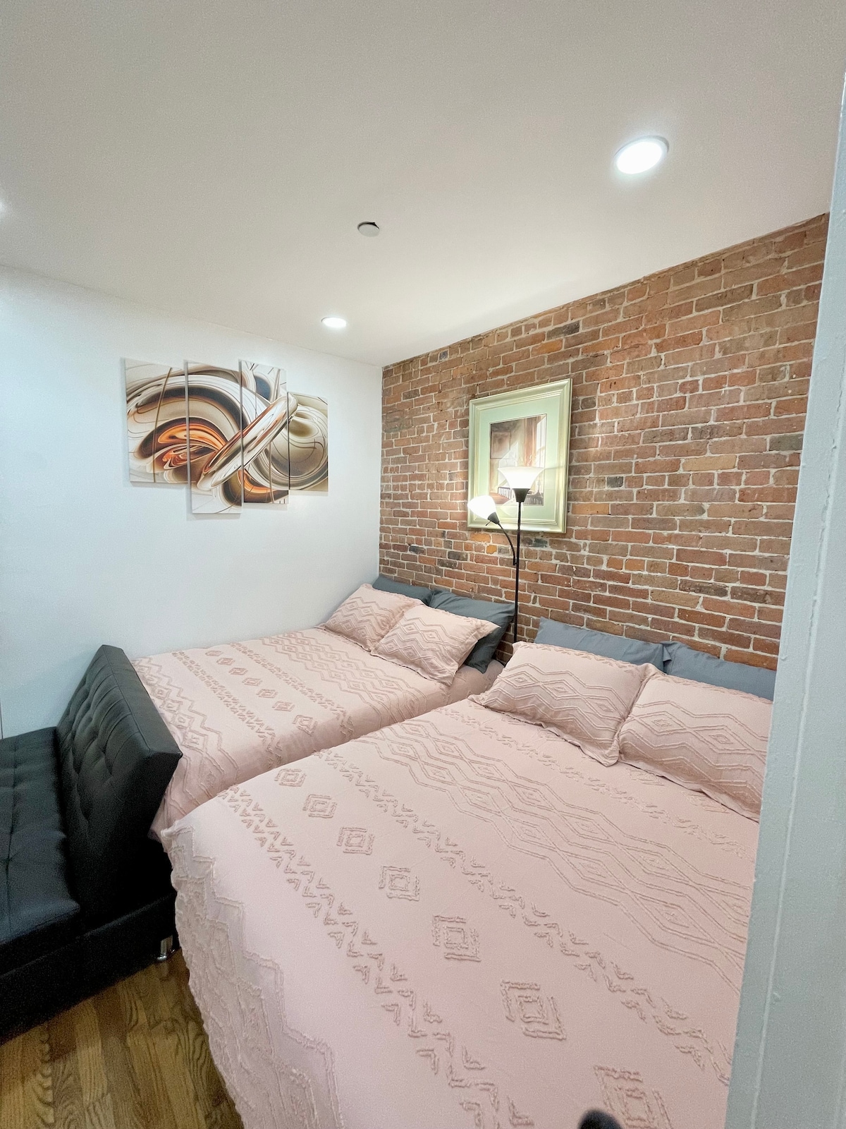Apartamento en el segundo piso con temática de Nueva York, ¡a solo un tramo de escaleras! Parada de autobús de Manhattan a pocos pasos, llega a Nueva York en 10–20 minutos. Cuenta con una acogedora cama tamaño queen, un sofá cama de tamaño completo en la sala de estar y una silla cama doble en una habitación junto al dormitorio principal. Ideal para 3–4 huéspedes, además de alojamientos para bebés/niños pequeños. Rodeado de restaurantes, tiendas y salones, ¡todo lo que necesitas a solo unos pasos! Podemos proporcionar un pase de estacionamiento público para visitantes si tienes un auto.
