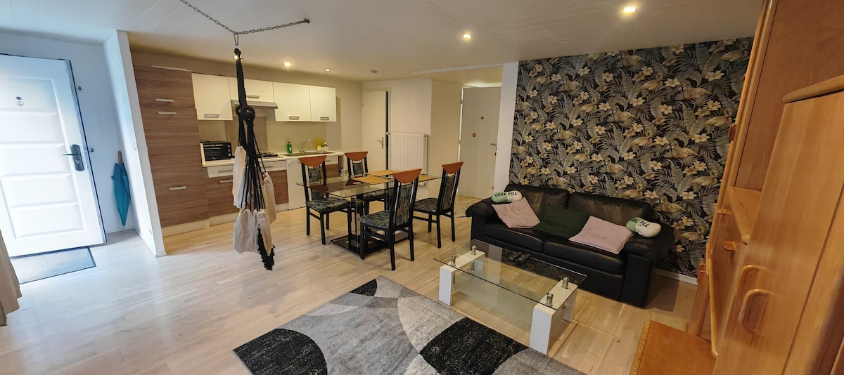 Disfruta de tu tiempo en nuestro elegante y amorosamente amueblado apartamento. Nuestro apartamento tiene una sala de estar/comedor abierta con cocina, un dormitorio separado y un baño con ducha. La cocina está equipada con lavavajillas, fogones, nevera (con congelador) y cafetera. En el dormitorio encontrarás una cómoda cama doble de 140 cm y un armario. Otro espacio para dormir está disponible en el sofá cama.