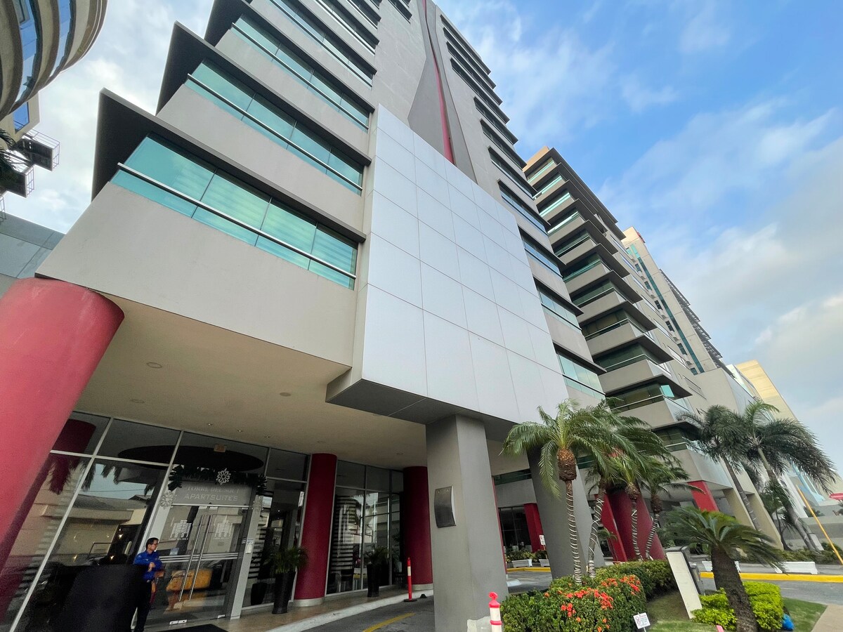 Suite amoblada, perfecta para 2 a 4 personas con excelente ubicación en Guayaquil! - Aeropuerto a solo 5 minutos - Atrás del C.C. Mall del Sol y Plaza del Sol. - Junto al Omnihospital (Farmacia 24/7). - Cerca del Centro de Convenciones. - cafeterías cerca (Sweet & Coffee, Juan Valdez, Le Croissant) *Servicios - Área social, piscina, gimnasio, estacionamiento privado. - Ascensor (acceso con tarjeta). - Seguridad y recepción las 24 horas. - Wifi (fibra óptica)