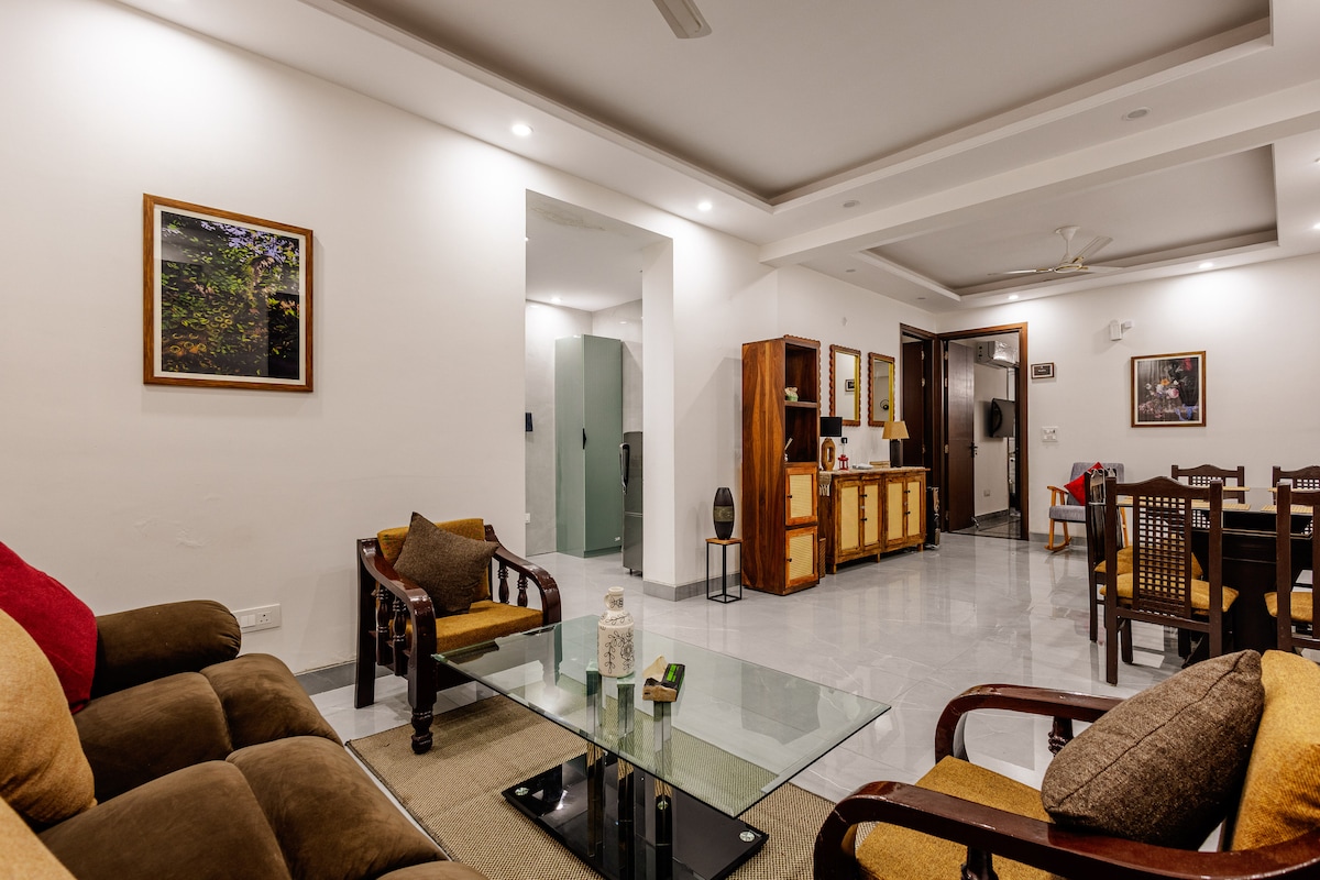 Experience contemporary living in this spacious apartment in Gurugram,designed for comfort and convenience.This is a 4bhk apartment,if you book for 4 people, you will get 2 Bedrooms,if you book for 5 or 6 people, 3bhk will be given. All bedrooms have ensuite bathrooms plus comes with fully equipped kitchen.Located in a prime area near DLF Cyberhub, Golf Course Road, Ambience mall and the Metro Station, the apartment offers seamless access to major business centers, malls, schools, and hospitals