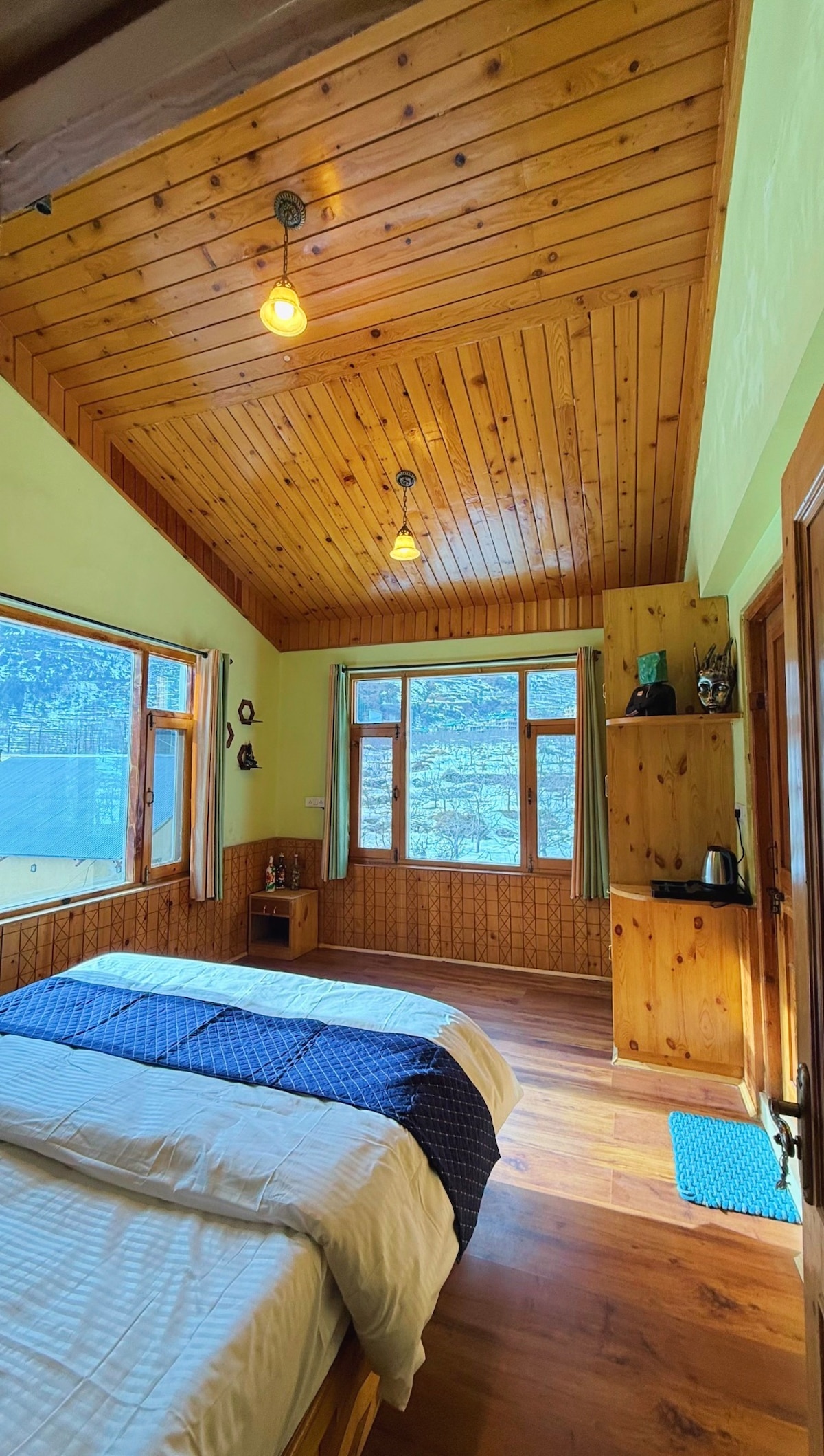 La granja es perfecta para los viajeros que buscan tranquilidad, belleza y una auténtica vida en la montaña. Ubicado en una ubicación pintoresca, el estudio ofrece espectaculares vistas al valle y a la montaña, con el sonido relajante de los pájaros y el suave rugido del río Beas creando una atmósfera verdaderamente relajante. El estudio totalmente equipado está diseñado para la comodidad y la simplicidad. Cuenta con una acogedora cama doble, suelos de madera, una mesa de estudio, un baño limpio y moderno y una cocina completa para cocinar.