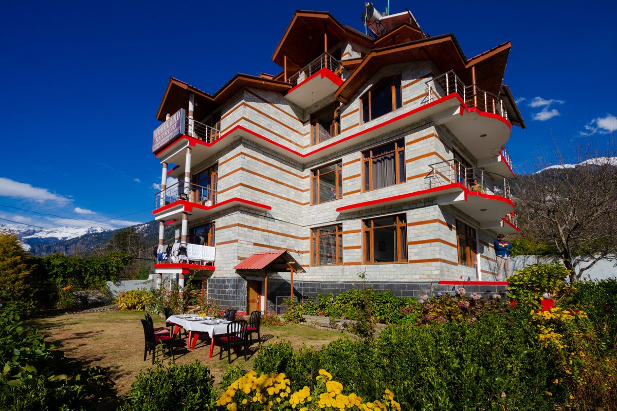 Escápate a "The Stone Hedge", donde el lujo se encuentra con la naturaleza. Nuestra exquisita planta baja de dos dormitorios de nueva construcción cuenta con amplias habitaciones con baños adjuntos para la privacidad. Disfruta de una cocina totalmente equipada y un acogedor comedor, perfecto para comidas familiares. El elegante espacio de estar invita a la relajación y el entretenimiento. Sal a un hermoso césped delantero para tomar el sol o relajarte en la zona de barbacoa, todo mientras disfrutas de las impresionantes vistas de Rohtang Pass y las montañas Pir-Panjal. ● Menú de comida.