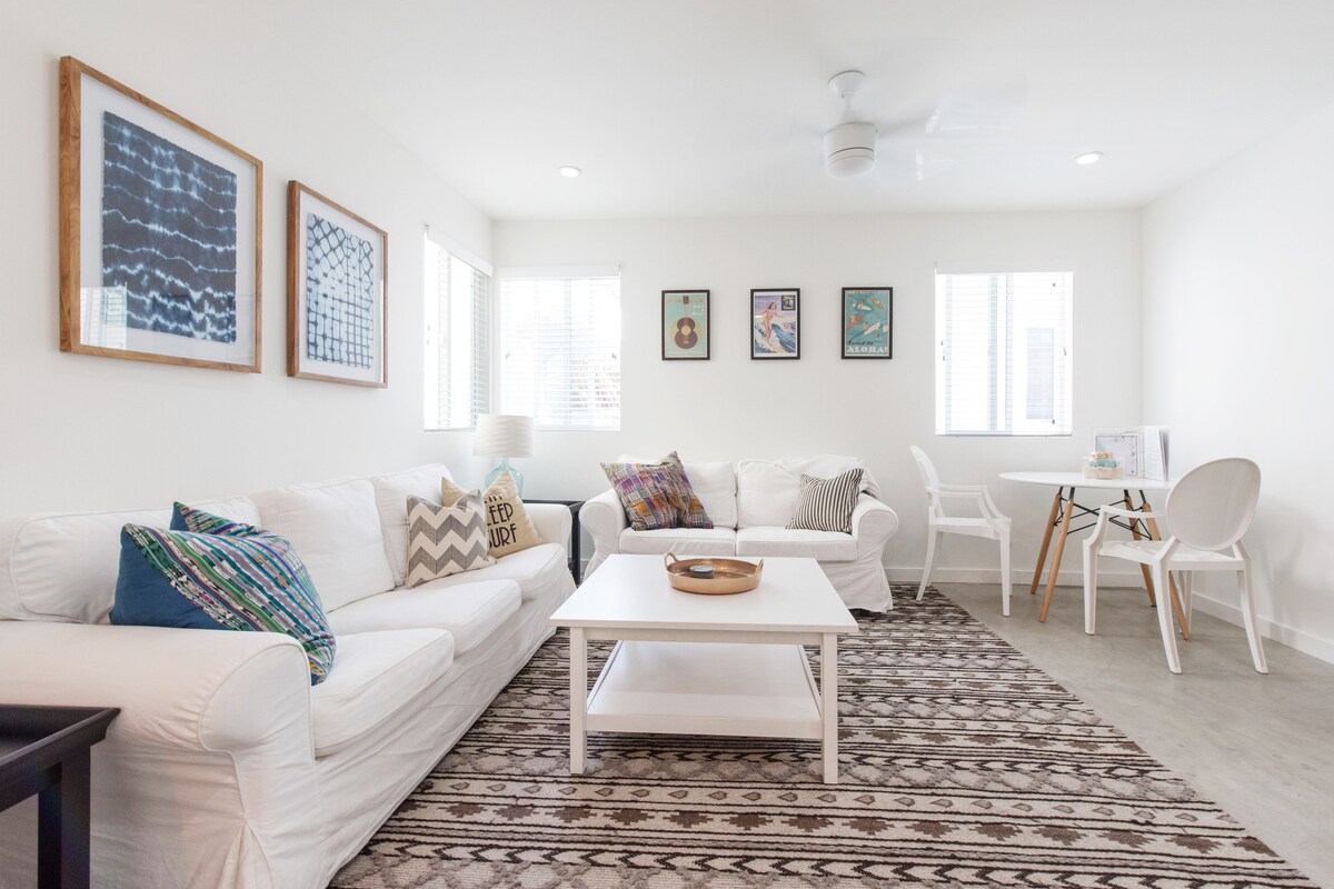 Mantente fresco con suelos de hormigón pulido y relájate en muebles blancos elegantes en esta casa de huéspedes espaciosa y céntrica. Disfruta de la cocina totalmente equipada, la televisión inteligente con servicios de streaming y las dos bicicletas proporcionadas para viajes tranquilos a la playa. Convenientemente ubicado a pocos minutos de hermosas playas, LAX y el estadio SoFi.