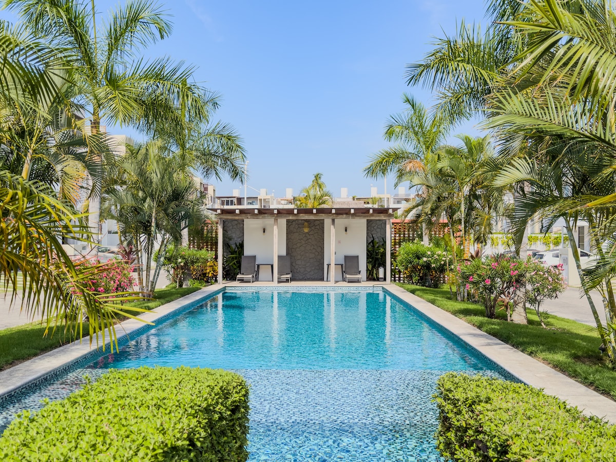 Relájate en esta escapada única y tranquila. Te ofrecemos un espacio cómodo y agradable, con detalles modernos ideales para disfrutar de unas vacaciones relajantes. Disfruta de una alberca templada dentro del departamento, de uso exclusivo para este alojamiento, así como de una cocina totalmente equipada y espacios diseñados para brindarte confort. Además, tendrás acceso al club de playa del complejo, ubicado justo enfrente; solo necesitas cruzar la calle (aprox. 2 minutos).