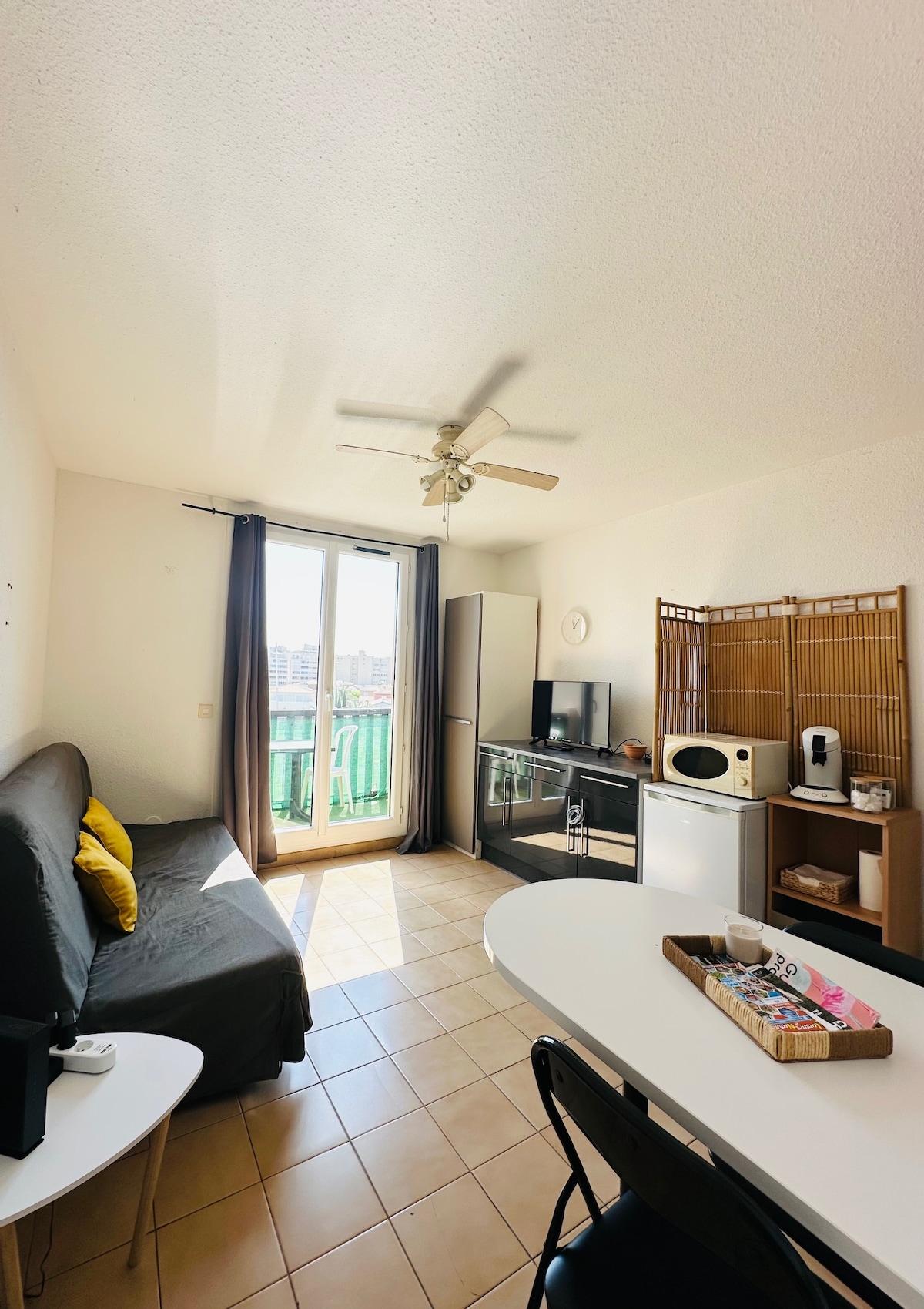 Pequeño apartamento de 20 m2 frente al mar, con vistas a los Pirineos, soleado (sombra por la mañana y sol por la tarde) Residencia segura a 50 metros de la playa en el segundo piso con ascensor Con capacidad para 4 personas máx. con 1 dormitorio tipo camarote, 1 sofá cama en la sala de estar 1 baño Wifi de fibra Cerca de todos los servicios comercio, restaurante de playa, lavandería Aparcamiento gratuito al pie de la residencia y en los alrededores (aparcamiento accesible para todos,no privado para el apartamento) No se admiten animales. No hay lavadora.