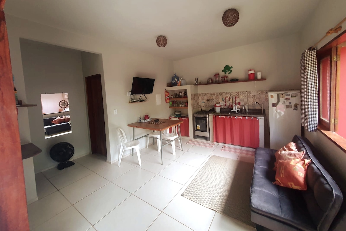 Piso en un condominio frente a la playa (condominio Villa do Pescador), privado, espacioso y acogedor, con cocina PRIVADA, balcón, hamaca, mesa de comedor/oficina en casa en el balcón, cama tamaño queen, aire acondicionado dividido, sábanas de algodón puro, sin televisión en red abierta, solo Netflix y wifi de cortesía. Un máximo de 3 personas, pagando una tarifa adicional. Súper bien ubicado, cerca de las tiendas locales.