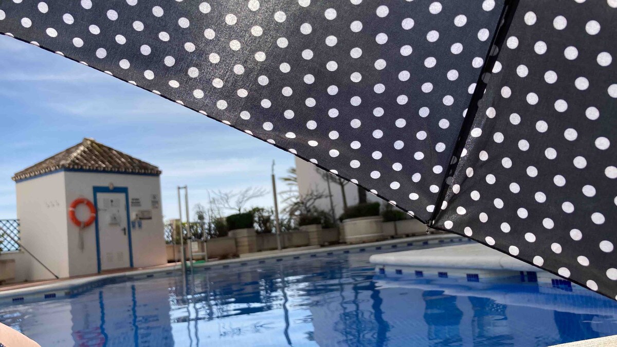 Cozy, bright, entirely renovated quality flat on the front line with sea views from the sunny and large balcony, both rooms and the bathroom. Features his and her shower, full kitchen, 2 tennis courts, 2 swimming pools (1 for children) large gardens, private beach area, free beach beds and private parking. We have a sandy beach with Blue Flag status and direct access to the sea boardwalk. Near Marbella and La Cala with 75+ restaurants and many shops walking distance. Strict cleaning protocols.