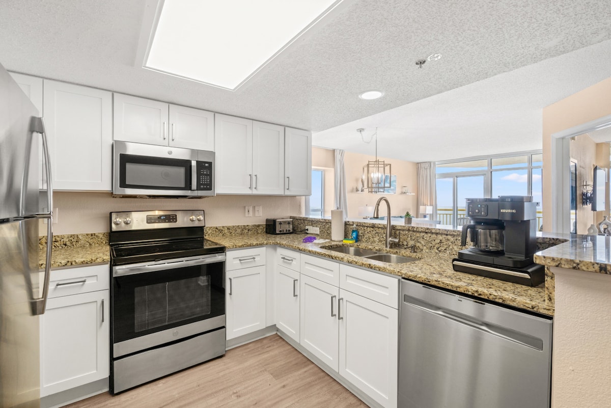 Lleva a toda la familia a este maravilloso condominio frente al mar en el cielo con mucho espacio para el sol y la diversión. Disfruta de las impresionantes vistas al mar y a la playa desde el balcón y la sala de estar. Este condominio de lujo de alta gama cuenta con 4 dormitorios con 2 suites principales, una gran cocina totalmente abastecida y lavandería en la unidad. El salón está abierto y tiene muchos asientos en el cómodo sofá y un televisor grande de pantalla plana para tu evento deportivo o experiencia cinematográfica.