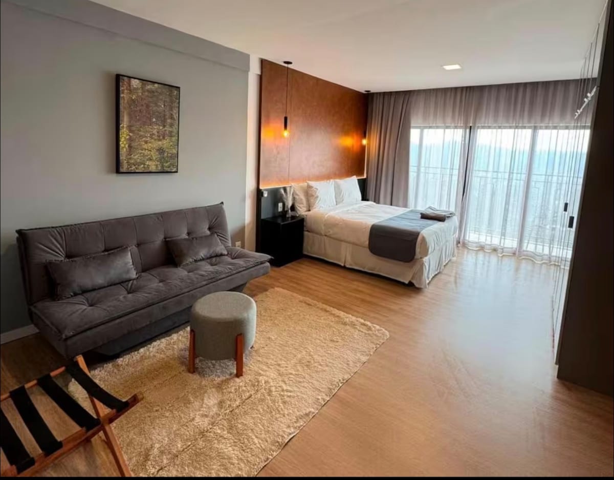 Quarto completo com banheiro, cozinha e vista.