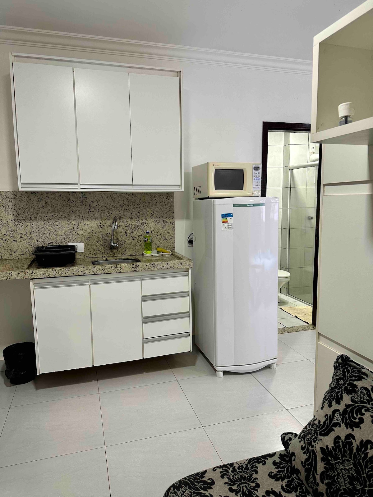 Kitnete inteira, tipo studio, bem localizada, perto da UEM e novo Centro, mercadão municipal, restaurantes, bares, supermercados e padarias. Possui 01 cama box de casal, roupeiro, mesa com cadeiras, bancada, ventilador de teto, ventilador de mesa, smart tv 32, pia, armários, frigobar, cooktop, microondas, banheiro com box de vidro. Fornecemos roupa de cama e banho, e mantas de microfibra. Prédio tranquilo e familiar, com lavanderia e Wi-Fi. Não possui vaga de garagem.