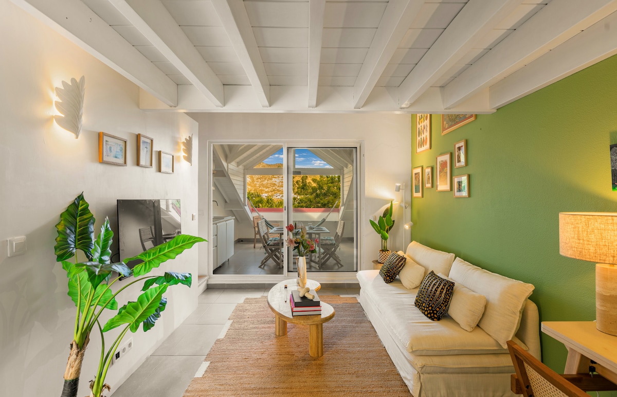 Un loft excepcional frente a la playa de Grand Case, que ofrece majestuosas vistas al mar y una ubicación privilegiada sobre el emblemático Rainbow Café. En temporada alta, un ambiente elegante y moderno marca el ritmo hasta las 23:00. Las tumbonas se pueden reservar directamente o a través de nosotros, pero los huéspedes que reservan con nuestra ayuda disfrutan de detalles privilegiados. Un refugio luminoso y sofisticado a pocos pasos de los mejores lugares de Grand Case.