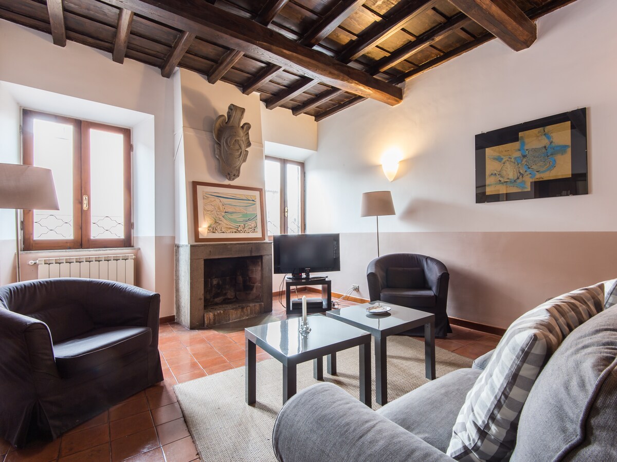 Ubicado en el corazón de Roma, en Via Giulia, considerada la calle más bella de Roma, nuestro apartamento de más de 100 metros cuadrados de 2 dormitorios y 2 baños es una mezcla de elegancia histórica y comodidad moderna. El edificio del siglo XV tiene un ascensor que hace que el quinto piso sea fácilmente accesible. Ambos dormitorios cuentan con baño privado. La sala de estar, con azulejos históricos, techo de vigas y chimenea, es perfecta para relajarse. Por último, la terraza de la azotea del edificio es el lugar ideal para disfrutar del espléndido clima de Roma y de las impresionantes puestas de sol.